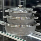 جنس بدنه این سرویس از گرانیت باکیفیت است که حرارت را بهصورت یکنواخت پخش کرده و مانع چسبیدن غذا میشود. دستههای تابه نیز از جنس گرانیت مقاوم در برابر حرارت ساخته شدهاند تا هنگام آشپزی، امنیت و راحتی بیشتری داشته باشید. دربهای این سرویس از شیشه پیرکس با حاشیه استیل ضدزنگ و دستهی استیل مقاوم طراحی شدهاند تا هم دوام بالا و هم ظاهری لوکس داشته باشند.